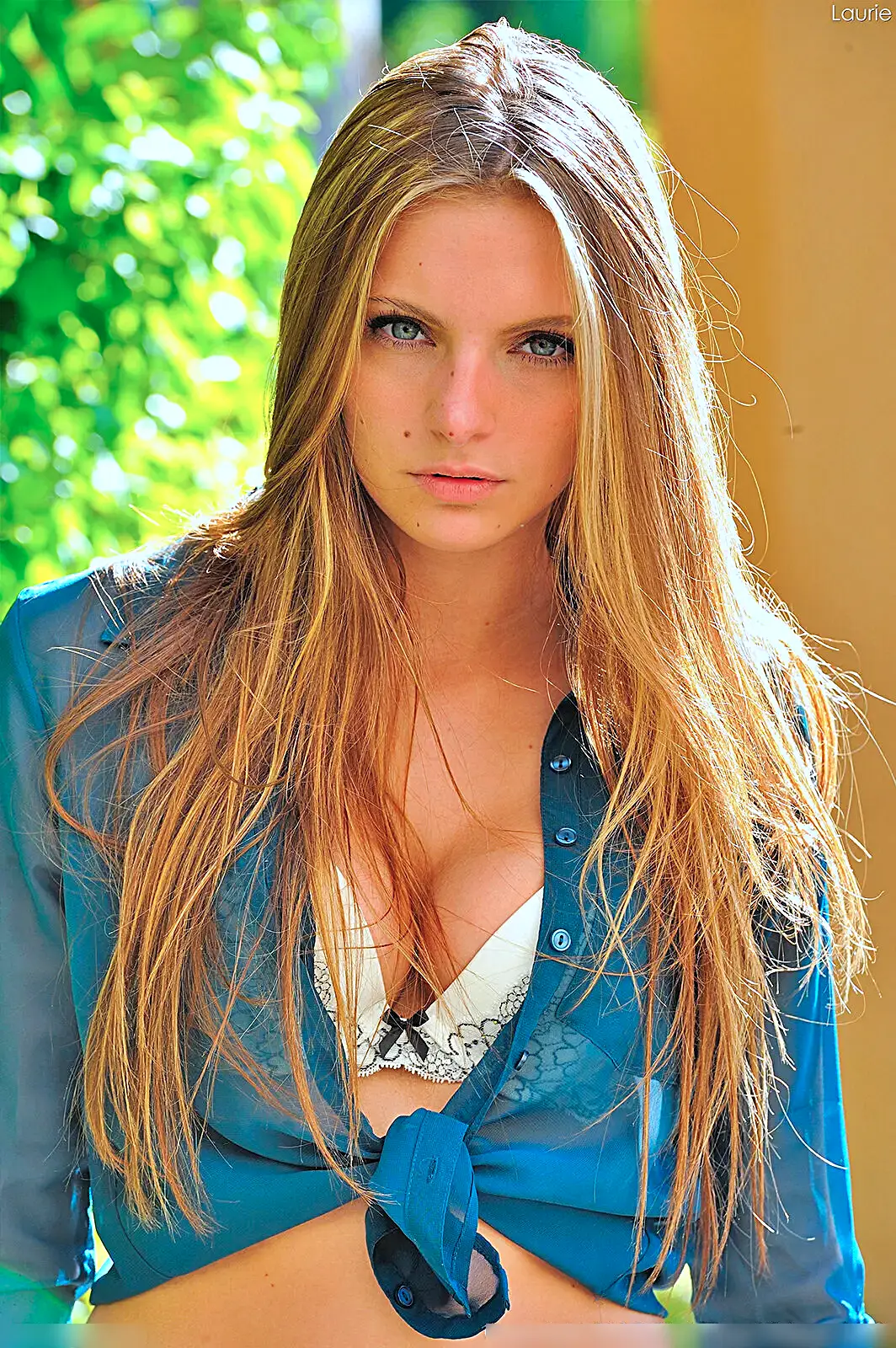 Σε μια ηλιόλουστη μέρα ανάμεσα σε έντονο πράσινο, η Laure ποζάρει με τζιν σορτς, λευκά ψηλοτάκουνα και ένα λευκό σουτιέν που κρύβεται κάτω από ένα μπλε τοπ.